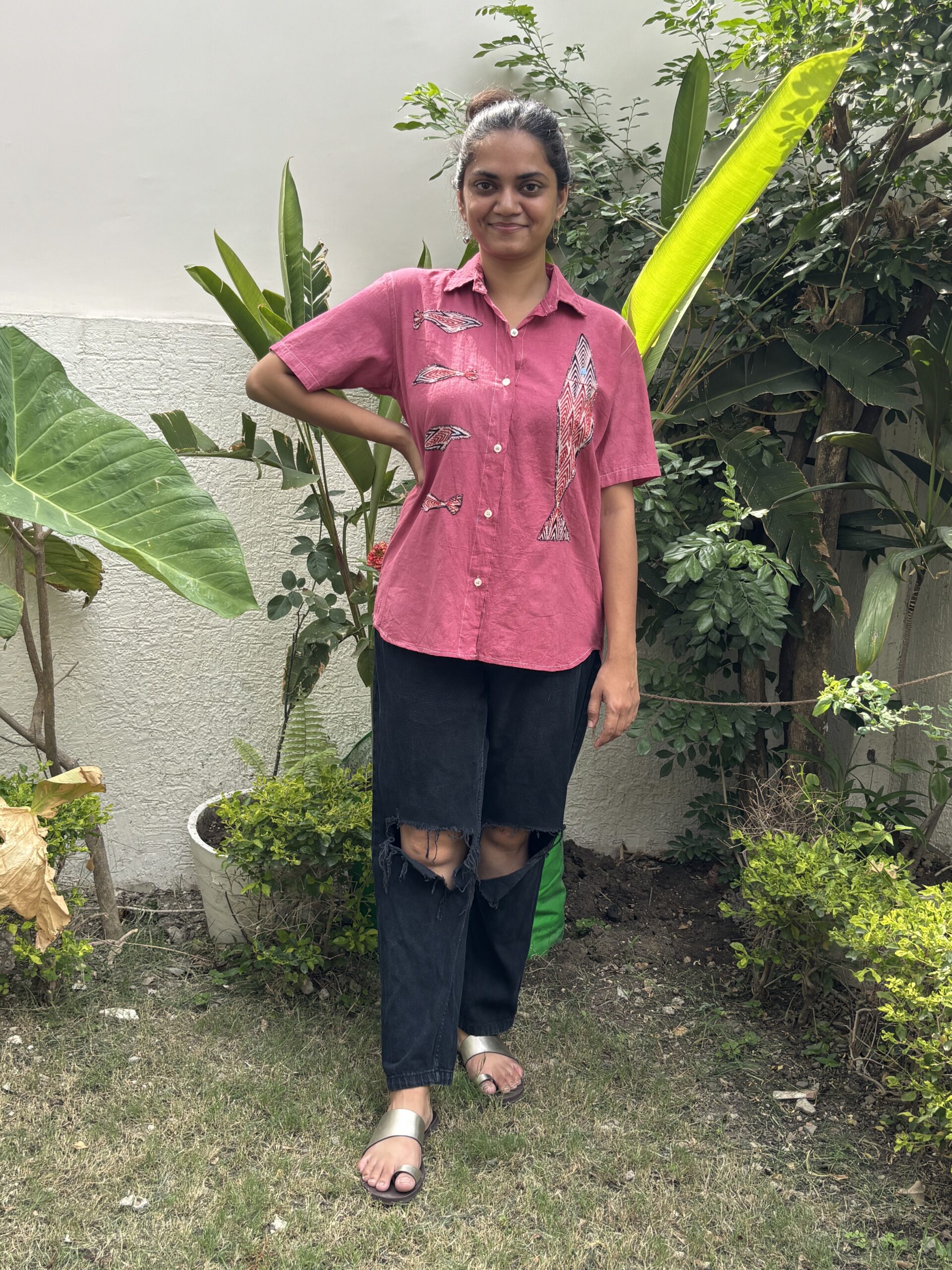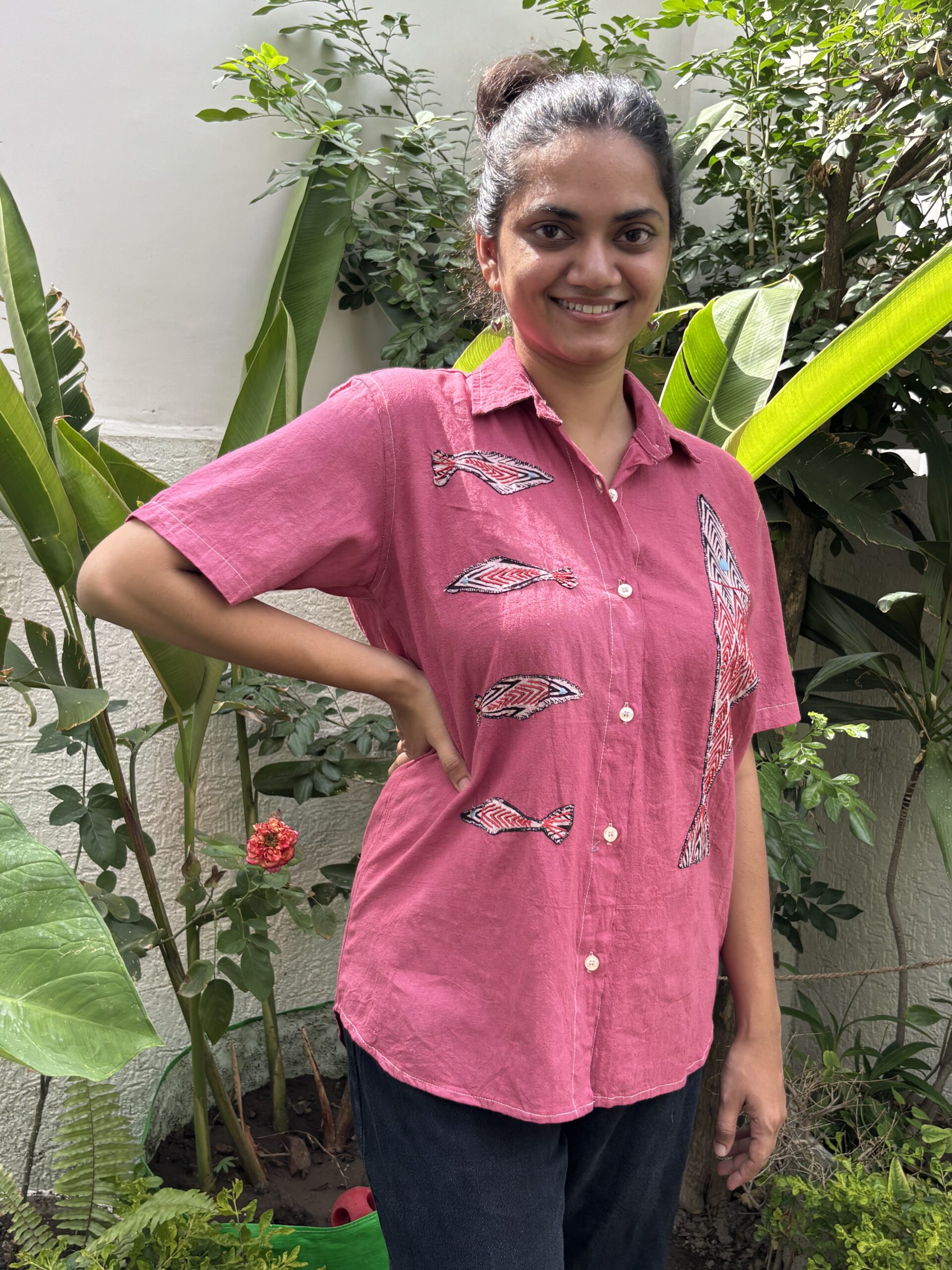 The Crimson Craft Shirt is as unique as it gets — a deep red khadi base with carefully appliquéd fish motifs swimming across both panels. The deep hand-dyed colour, combined with the playful design, makes it a true conversation starter. Made from breathable, textured khadi, it carries the rustic charm of handloom fabric while offering a crisp, comfortable fit. Pair it with neutrals to let the red shine or clash it with prints if you love to experiment.Additional information