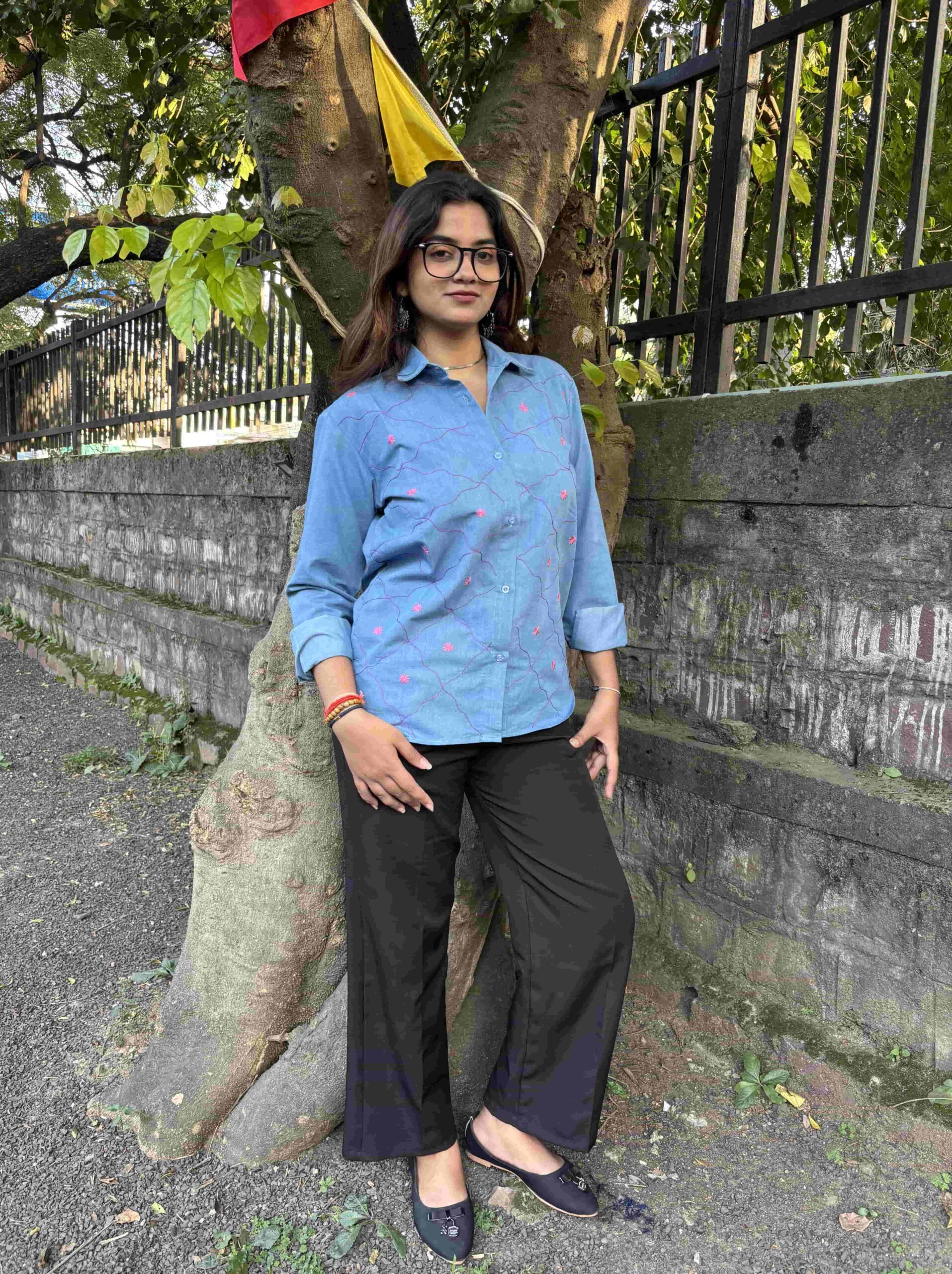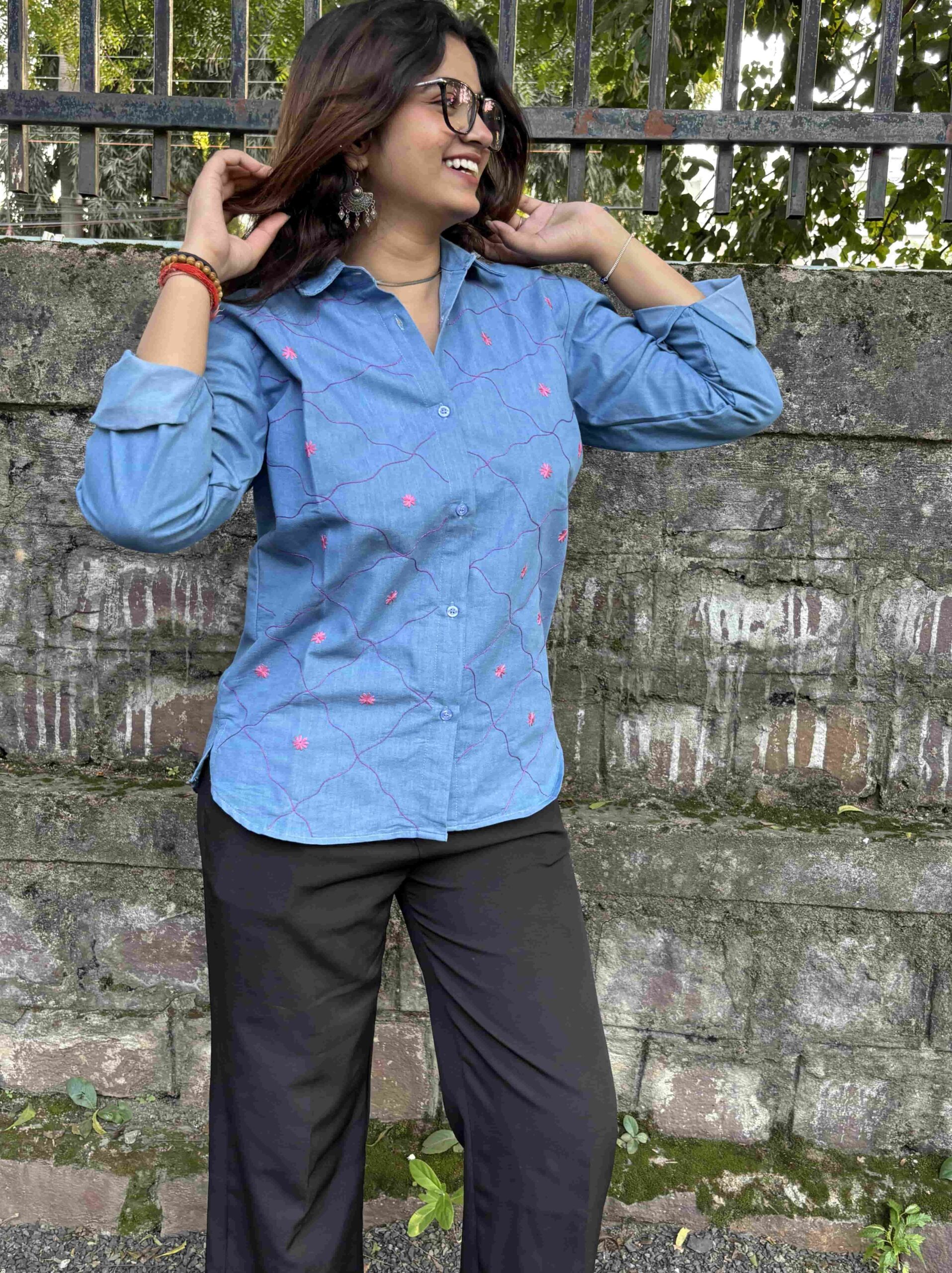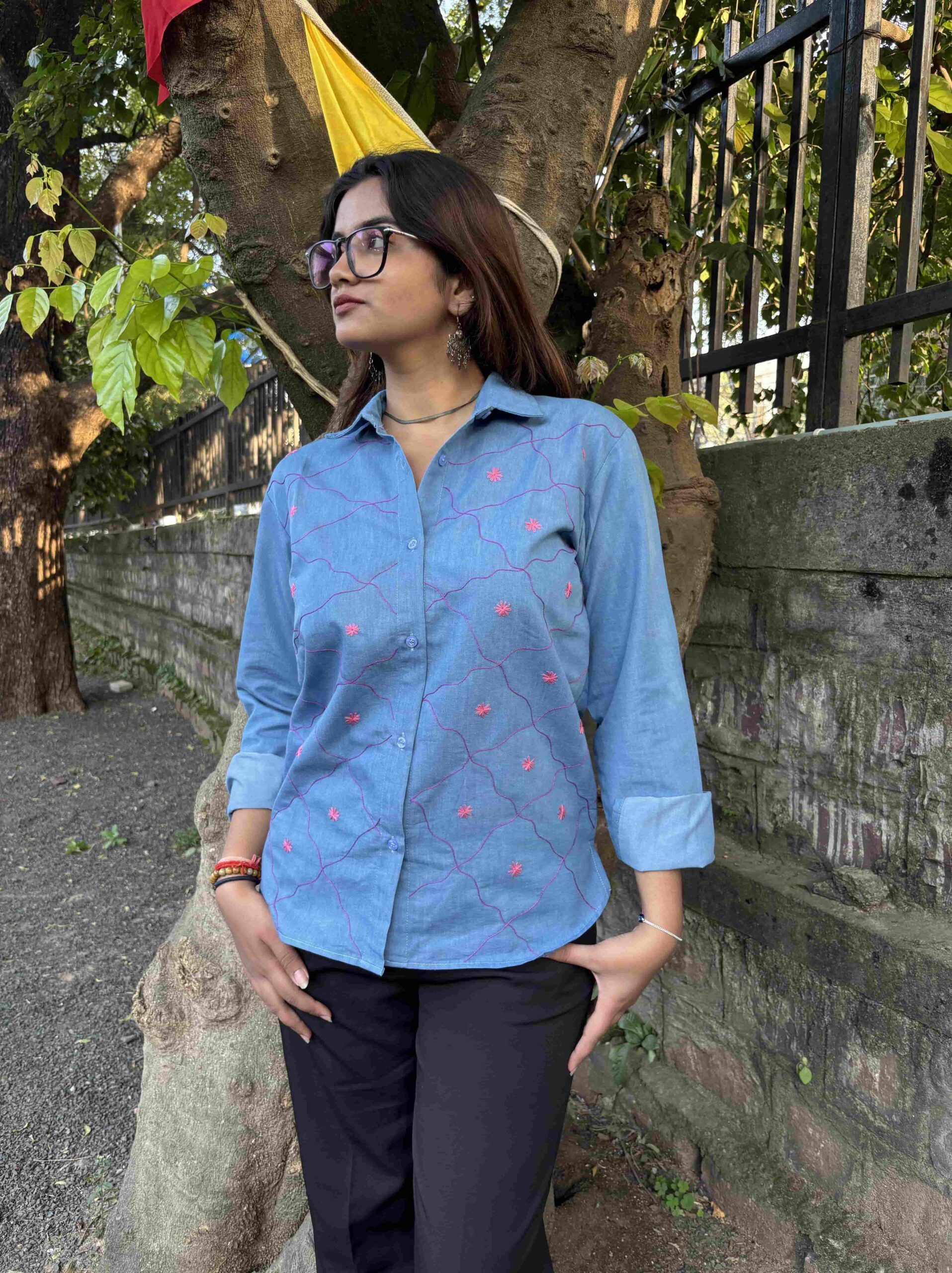 The Floral Network Shirt brings together craft and contemporary ease — light blue denim panels embroidered with shaded purple, pink, and light blue threads in crisscross geometric patterns. Tiny floral motifs add a touch of playfulness to the strong, linear base, making it the perfect mix of bold and delicate. Pair it with your favorite pants to instantly spruce up any look — from workday casuals to weekend wanderings.Additional information