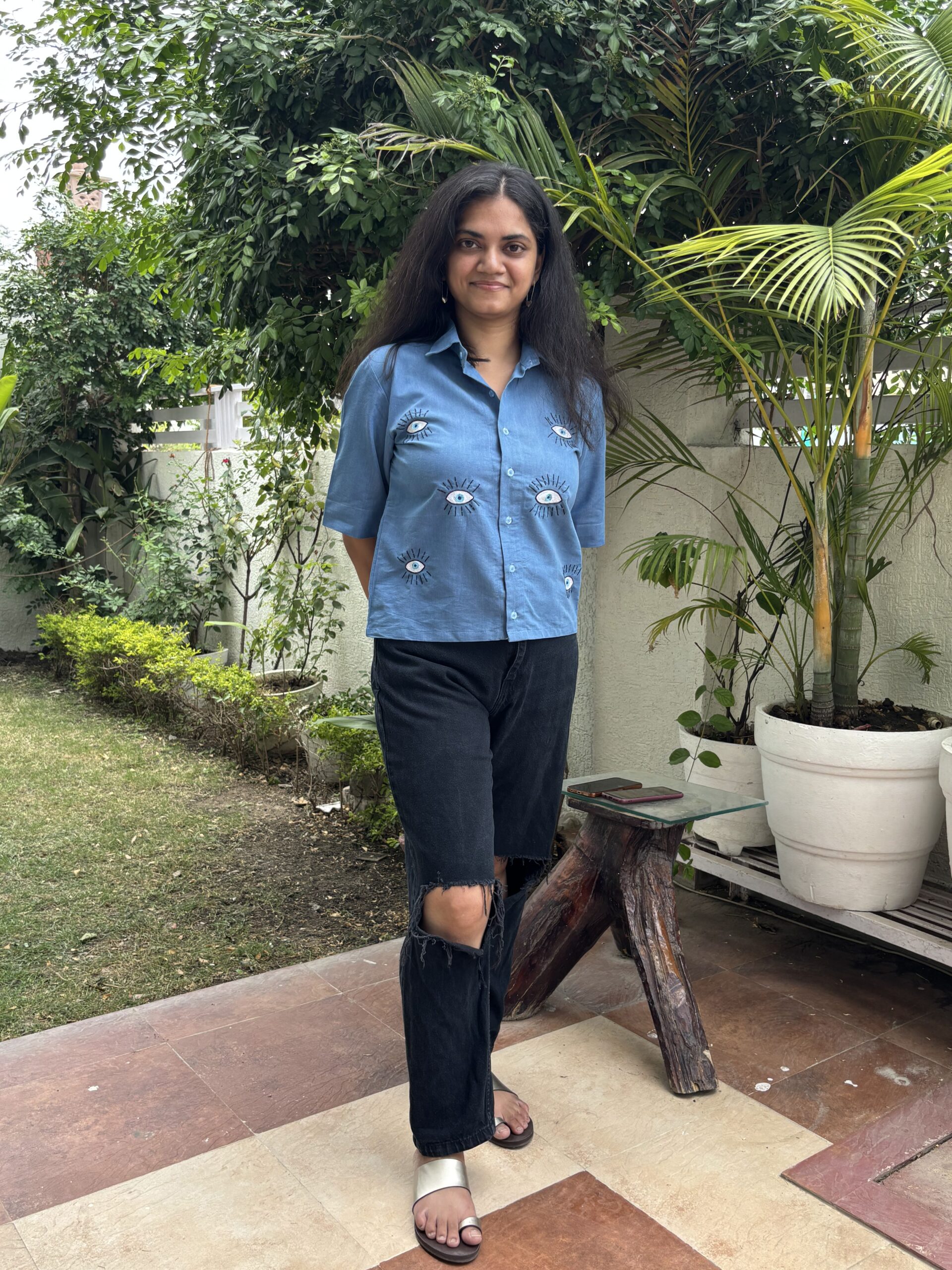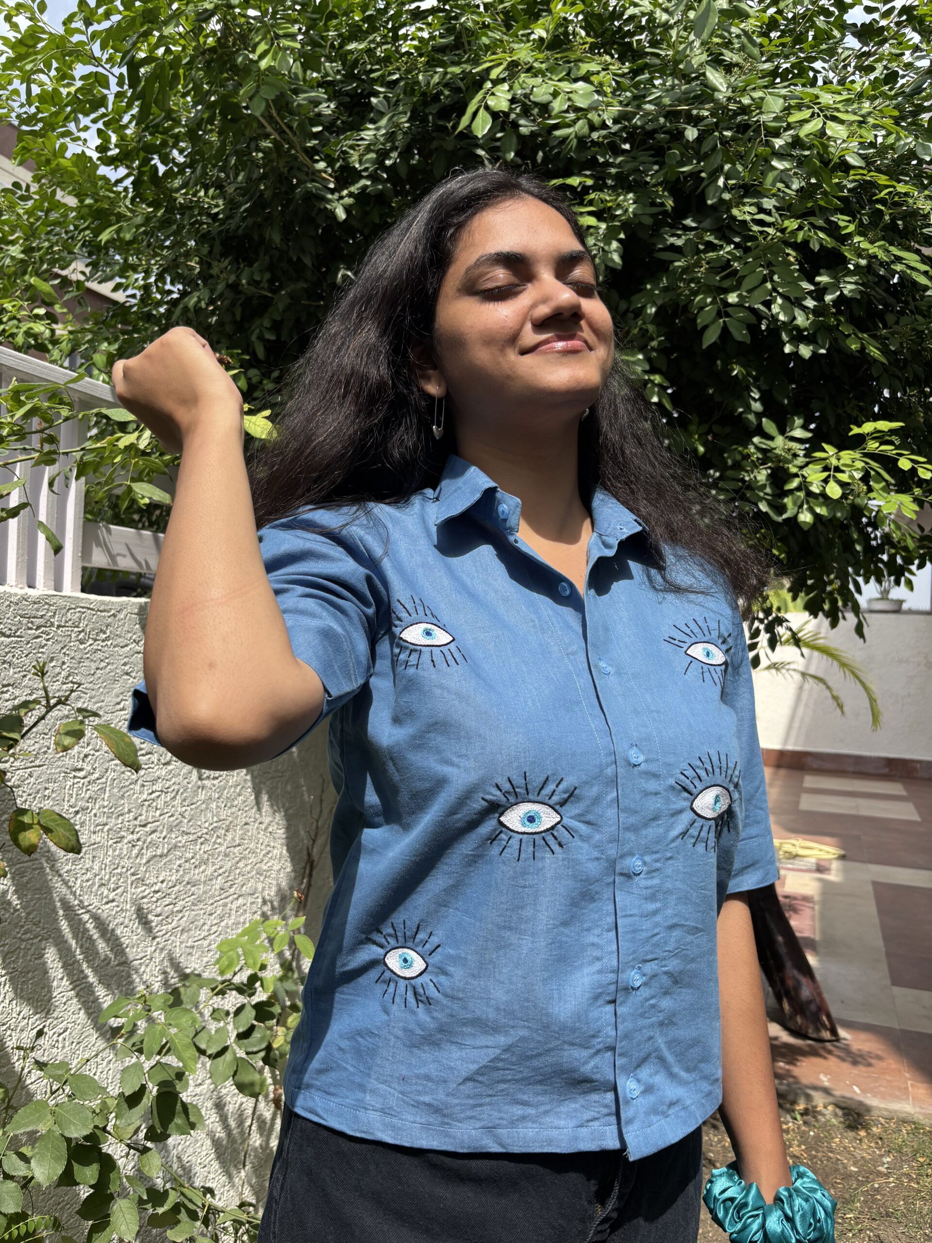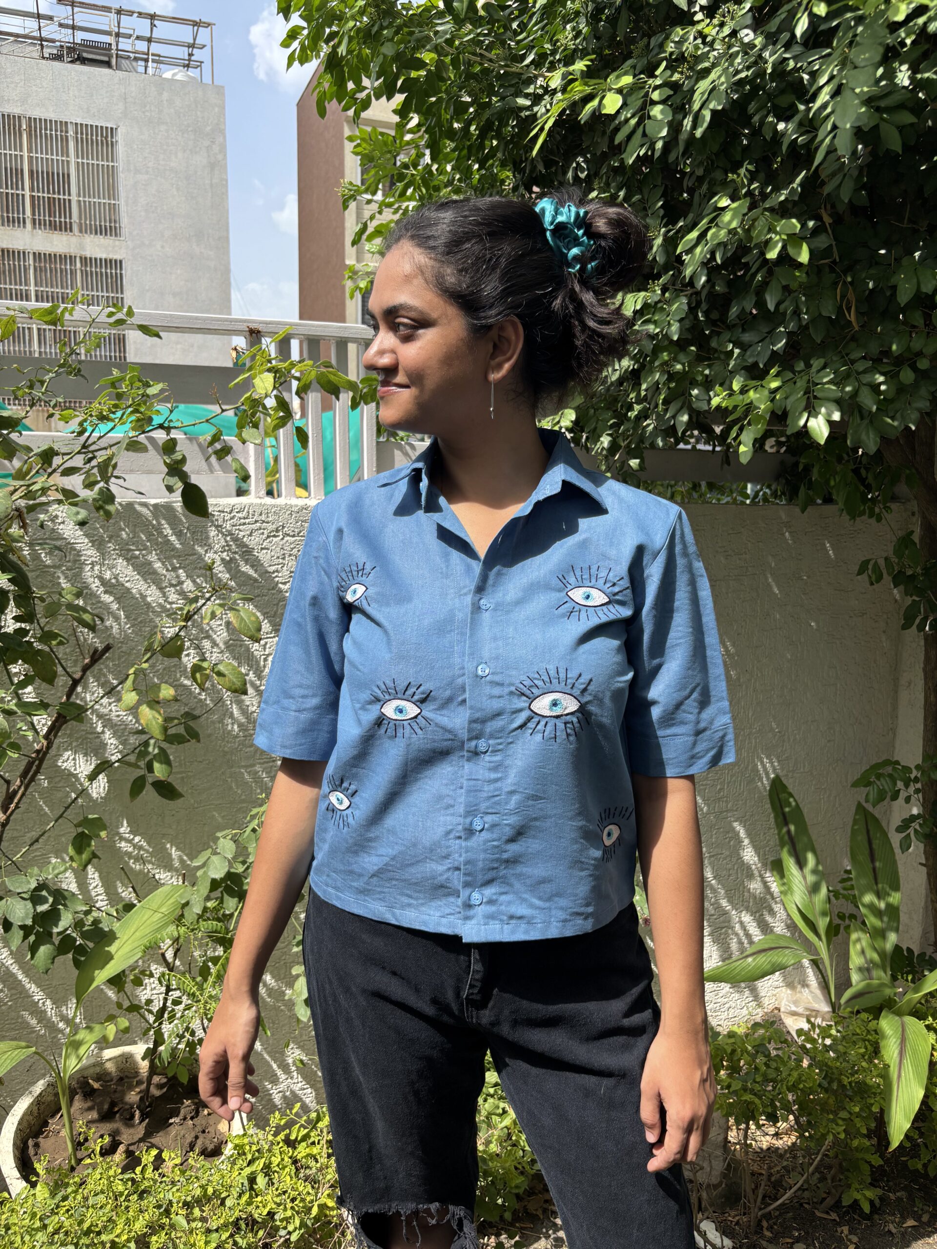 The Nazar Bindu Shirt brings the viral evil eye trend to life, embroidered in intricate chain stitch on soft light blue denim. Cropped with half sleeves, it’s playful yet powerful — the kind of piece that instantly sparks conversation. Made in breathable cotton denim, it’s comfortable to wear and easy to style. Pair it with high-waist trousers, shorts, or skirts — the evil eye is all set to keep the attention (and the compliments) on you.Additional information