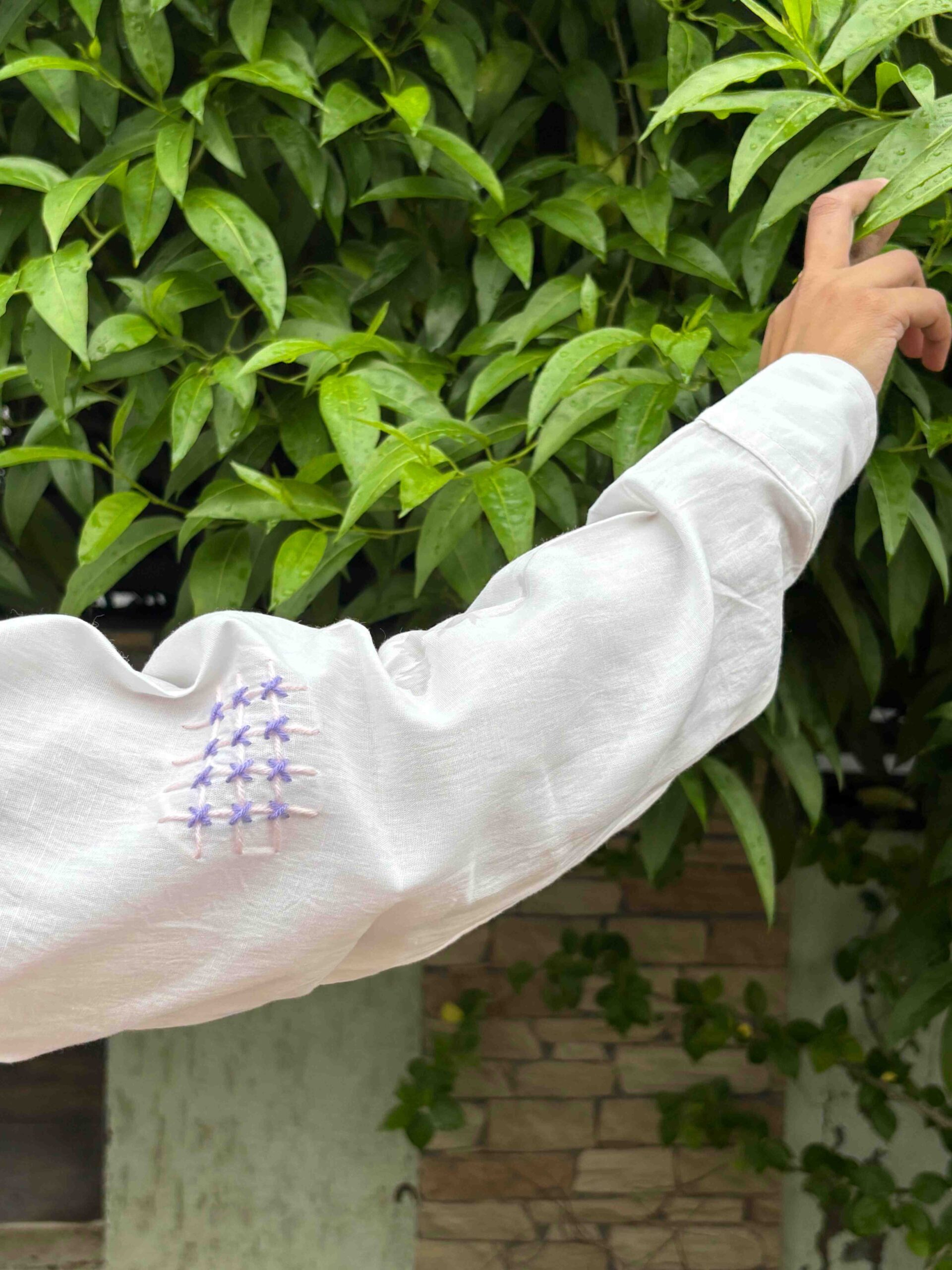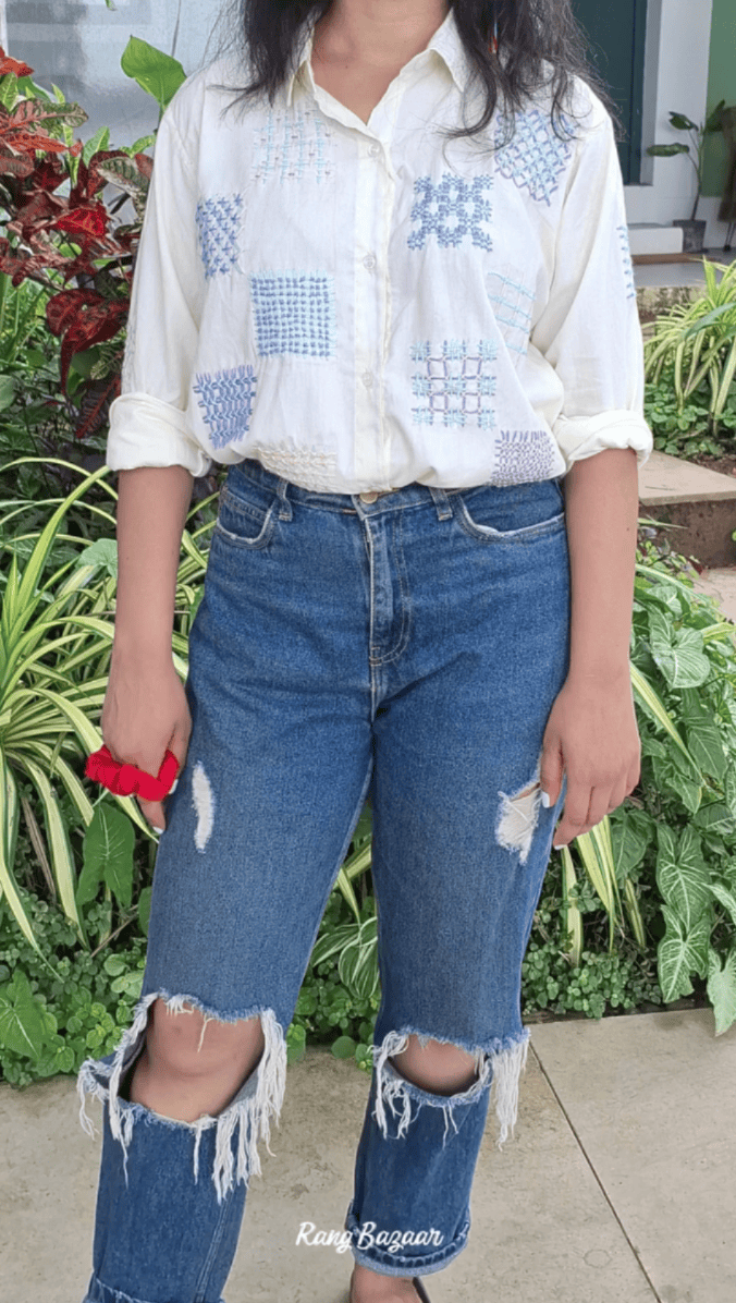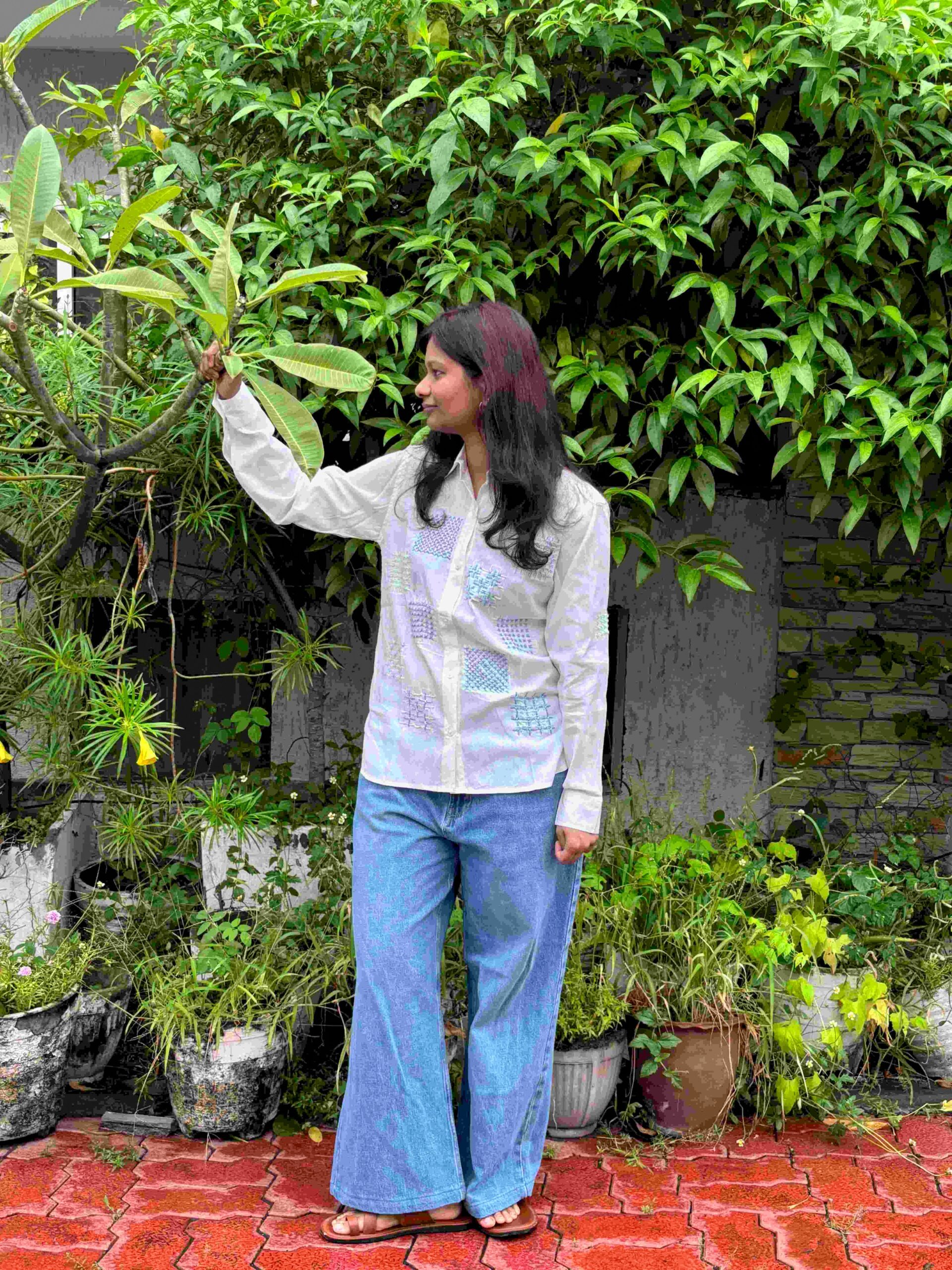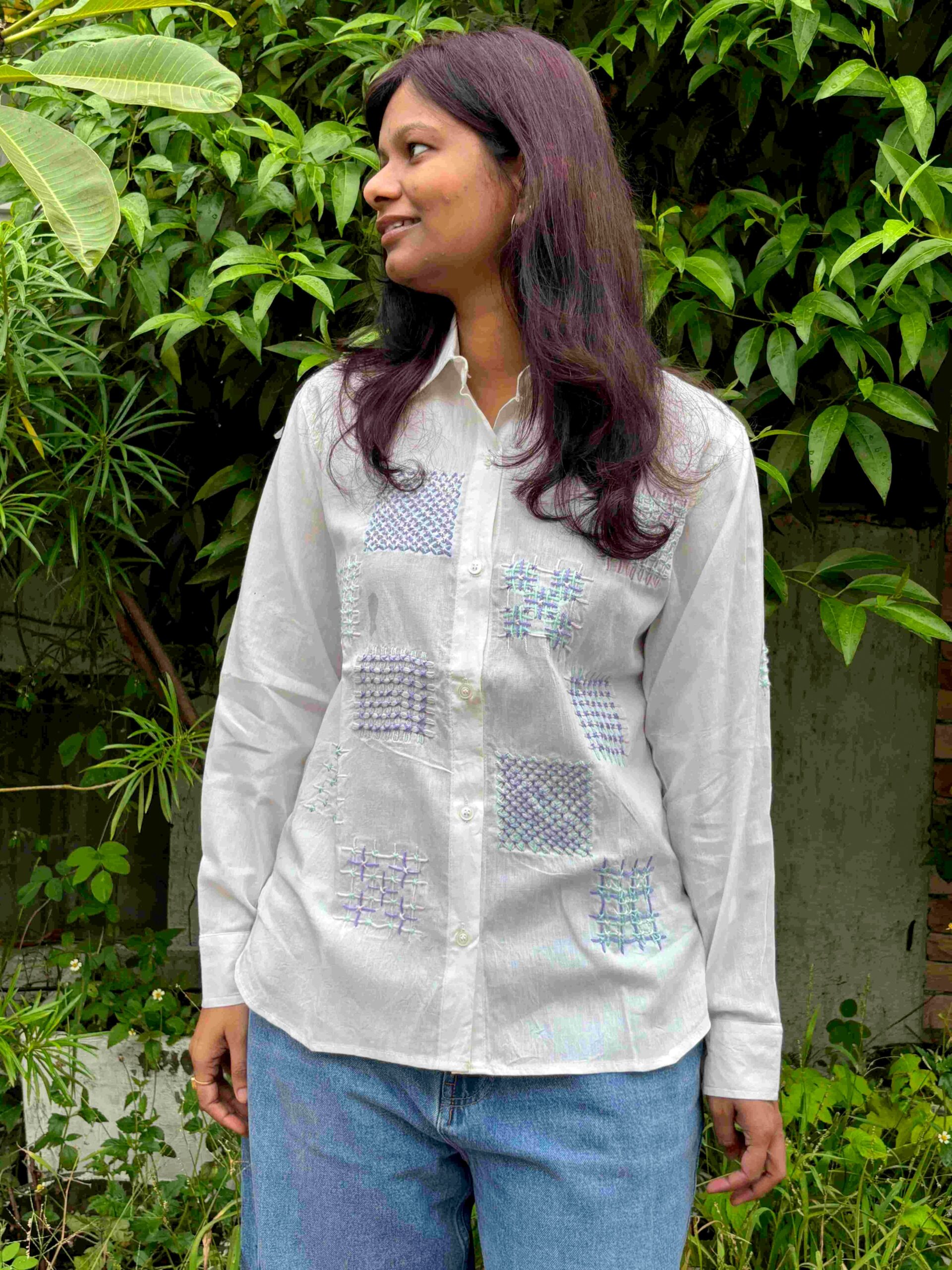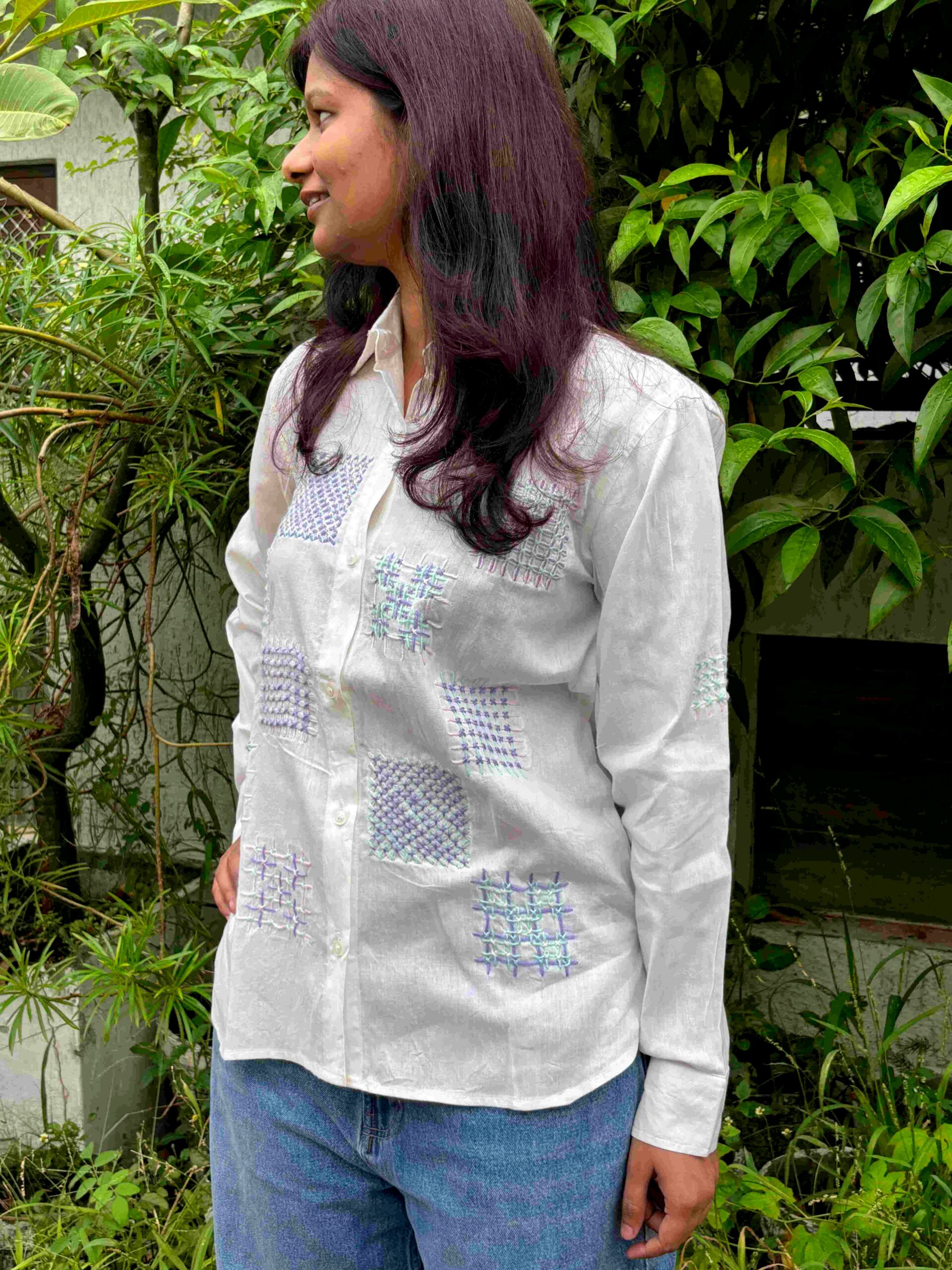 The Pastel Network shirt is crafted in premium cream poplin, known for its crisp finish and flattering fit. What makes it truly stand out is the hand-done couching embroidery across the shirt, using pastel pink, green, and purple wool threads in a playful checkerboard pattern. A Rang Bazaar bestseller, it strikes the perfect balance between classy and statement-making. Lightweight yet structured, this shirt is ideal when you want to look sharp while carrying a touch of colour and craft.Additional information