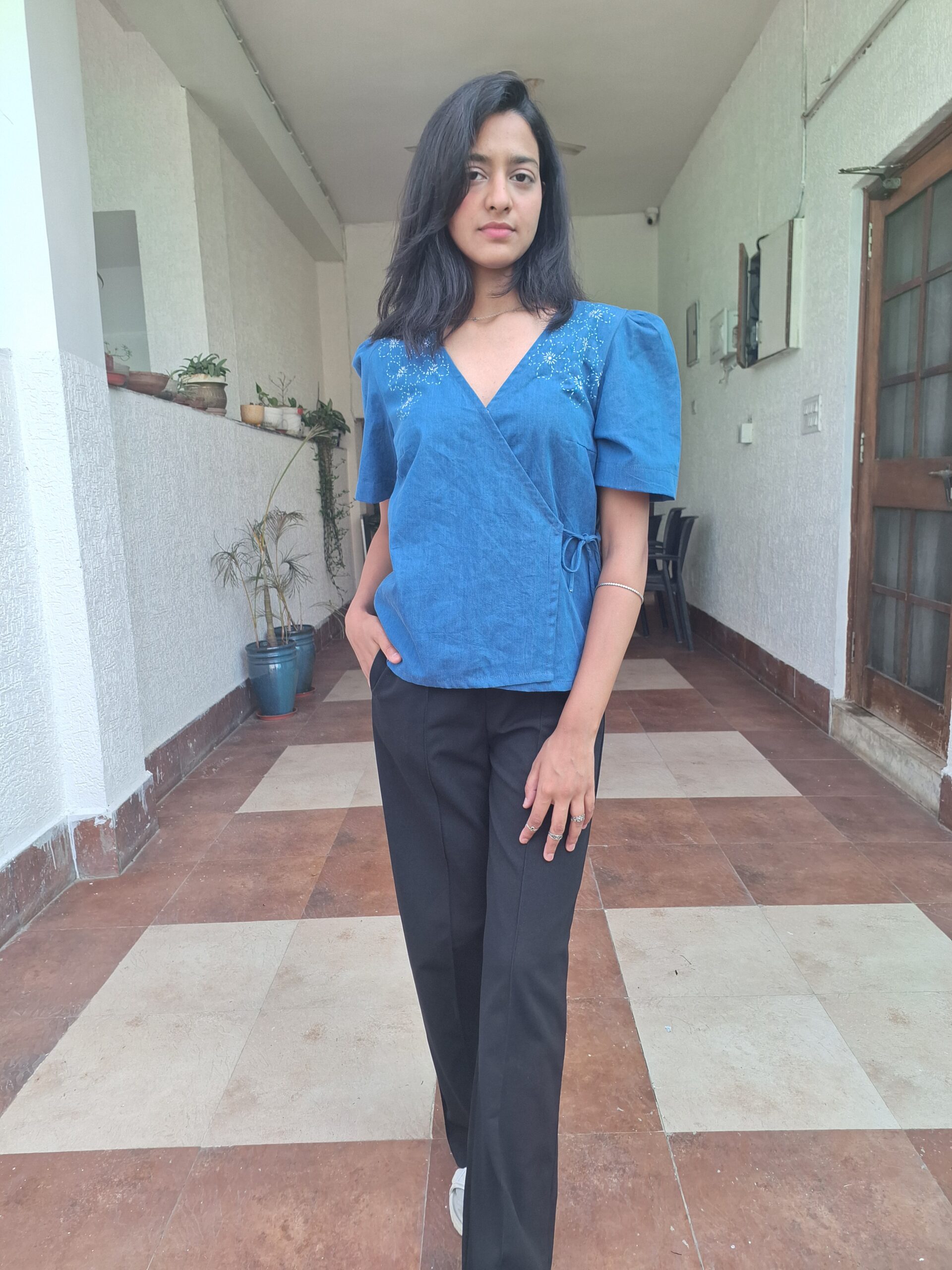 The Wildflower Wrap Top is where soft meets strong. Made in lightweight denim, it features delicate white katha-embroidered flowers near the neckline, a flattering wrap silhouette, and puffed half-sleeves that bring in a touch of romance. It’s perfect for all the soft-core girlies who hold immense power — feminine yet commanding, playful yet poised. Pair it with white pants for a fresh look, or dress it down with denims for effortless chic. MADE BY PINKYAdditional information