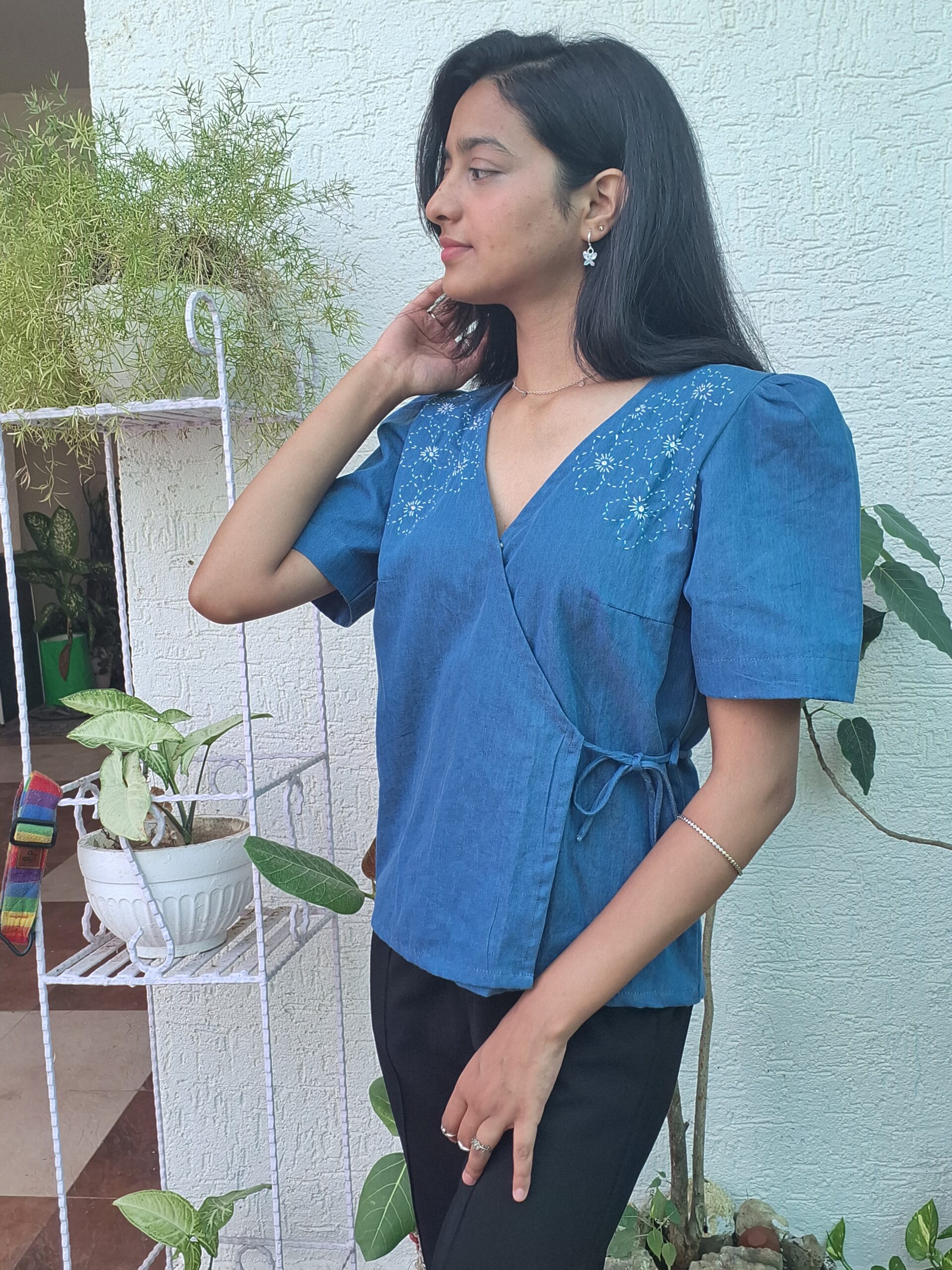 Denim wrap-around top with puffed sleeves and white floral katha embroidery.